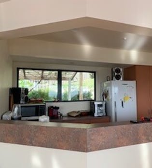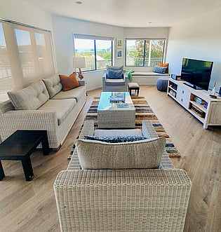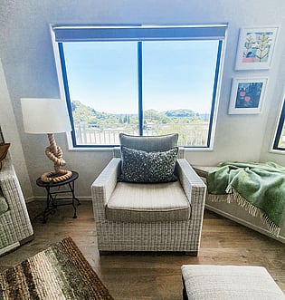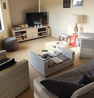 The living room configuration was changed to allow for a window seat to admire the beautiful view which was initially the space for the TV and the blind was always down. The old couches were re-upholstered in good outdoor fabric so durable and tolerant to the sun. A new rug and soft furnishings have completed the look, of which the owners are now very happy.